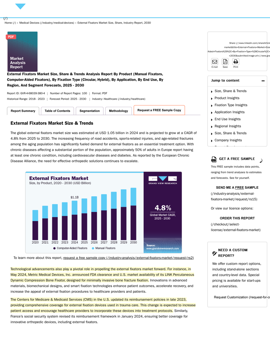 Grand View Research’s 2025 external fixator market report notes Metric Medical Devices, Inc.’s technological advancements play a pivotal role in propelling the external fixators market forward with its LINK™ Percutaneous Dynamic Compression Bone Fixator, designed for minimally invasive bone fracture fixation.